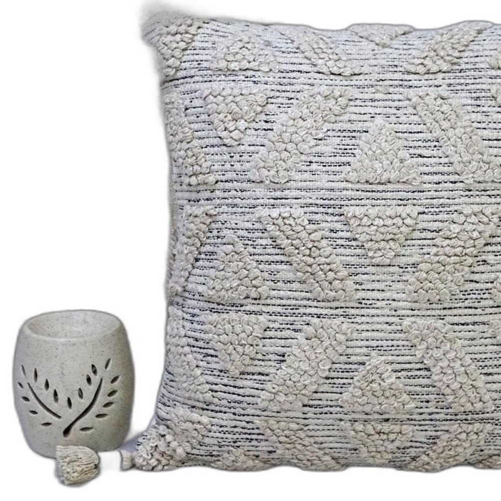 This 22" x 22" off white geometric zippered handmade cotton blend throw pillow with tassels will add a beautiful decorative accent to your decor. Charming decorative tassels give this design texture along with a hand-crafted look and feel. For anyone that loves to decorate or accent their space with color and texture. Decorative pillows are a great way to change up the look and feel of your space easily and quickly. 10" H x 22" W x 22" D