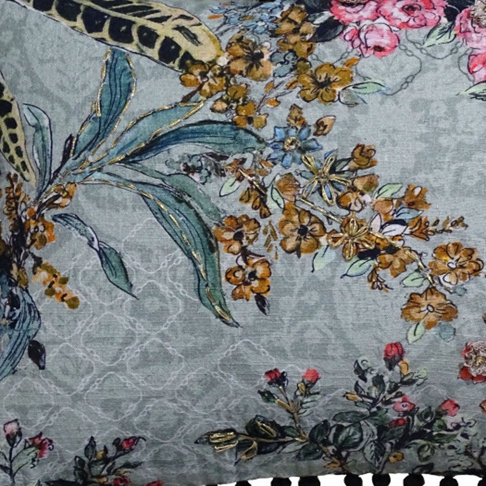 14" X 20" Green And Yellow Floral Zippered Handmade Cotton Blend Throw Pillow With Pom Poms