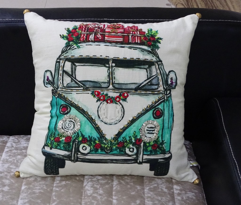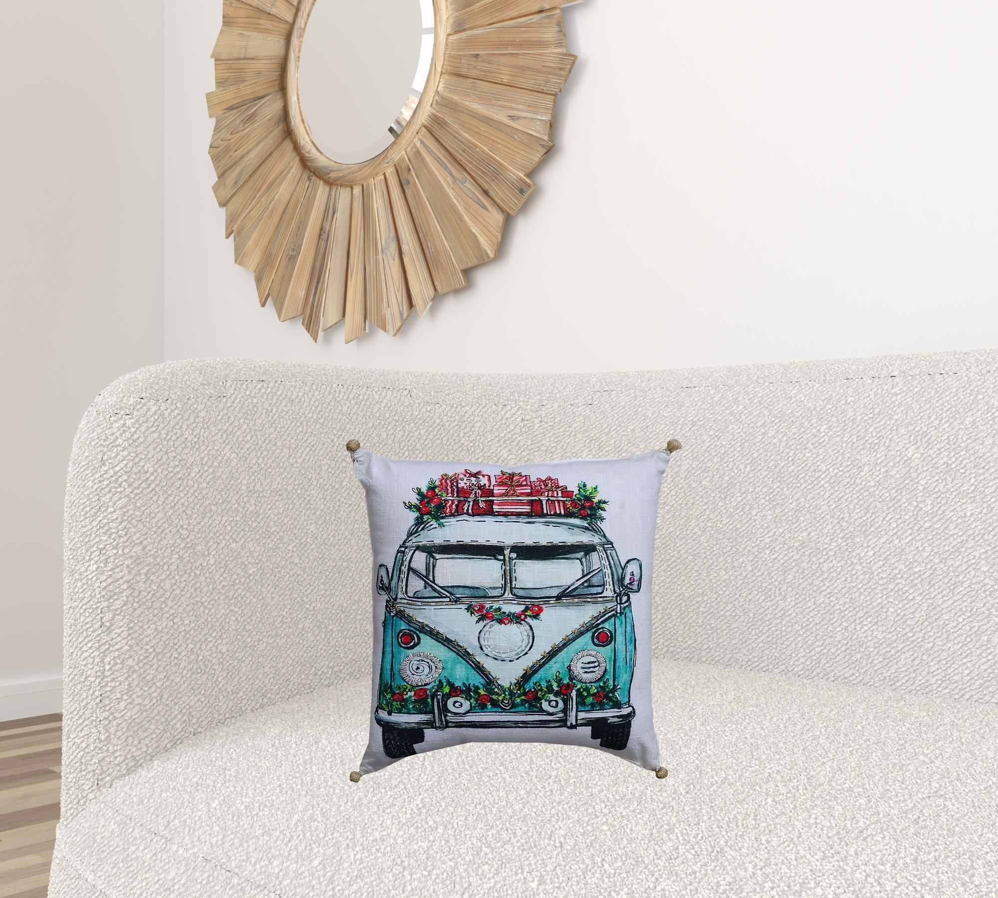 This 18" x 18" red and green zippered handmade cotton blend christmas holiday van throw pillow with embroidery is the perfect way to celebrate and decorate your living room, family room, bedroom, or office for Christmas. For anyone that loves to decorate or accent their space with color and texture. Decorative pillows are a great way to change up the look and feel of your space easily and quickly. 10" H x 18" W x 18" D