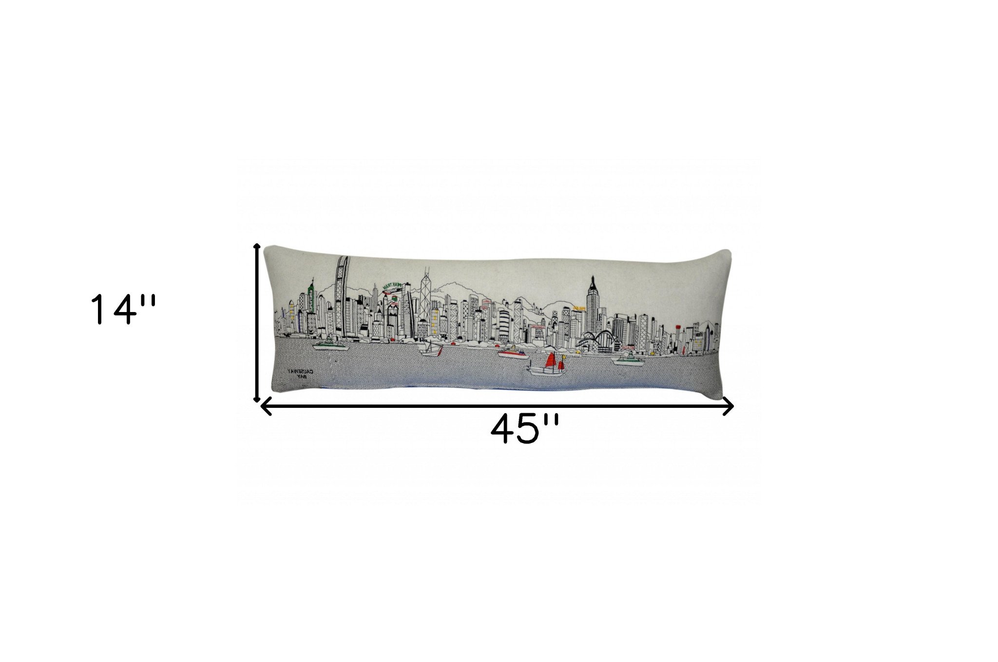 Showcase one of the most famous cities in the world with our Cream Color Hong Kong Daylight Skyline King Size Lumbar Decorative Pillow. This daylight view of Hong Kong from Causeway Bay, is a stunning way to represent one of the most important and travelled cities in the world. The gorgeous art features famous architecture and landmarks rendering a modern whimsical way to bring this iconic cityscape to life. Made of a wool/nylon blend, this high quality stitched decorative pillow features black on white embroidered artwork mixed with pops of color that highlight important and recognizable icons from this fabulous city. This pillow makes a great gift, decorative accent and conversation piece. 14-inch H x 46-inch W x 4-inch D