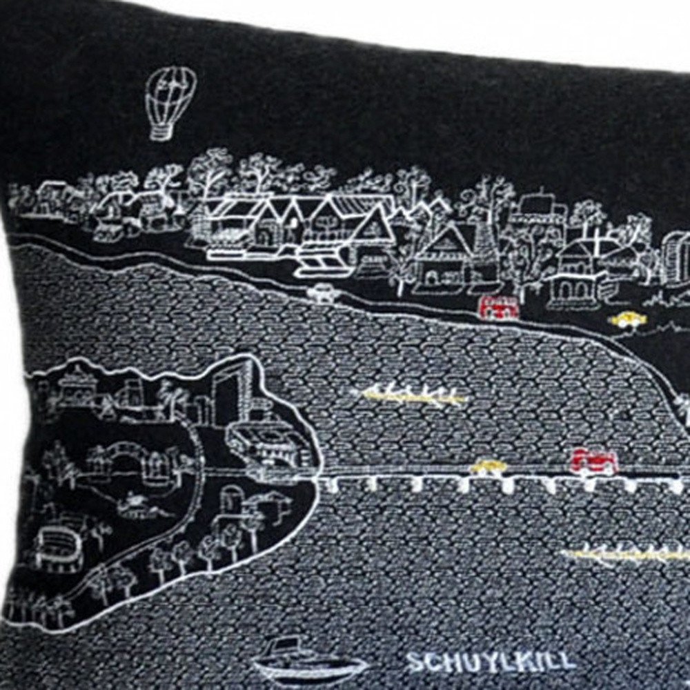 Showcase this famous city, with our Black Color Philadelphia Nighttime Skyline Queen Size Lumbar Decorative Pillow. The Nighttime view of the Philly shore line from the Schuylkill and Delaware Rivers is picturesque. The gorgeous art features many famous landmarksand references, rendering a modern whimsical way to bring this iconic cityscape to life. Made of a wool/nylon blend, this high quality stitched decorative pillow features white on black embroidered artwork mixed with pops of color that highlight important and recognizable icons from this fabulous city. This pillow makes a great gift, decorative accent and conversation piece. 14-inch H x 46-inch W x 4-inch D