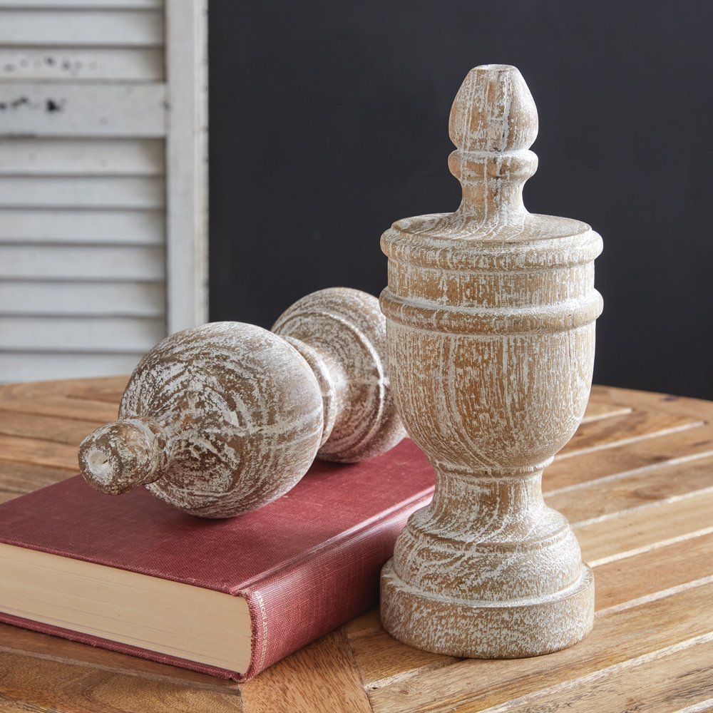 Curated with elegance and rustic details, our Finial Sculpture is an impressive touch to a table. Item is created with wood and a whitewashed finish, giving it a time-worn look that compliments almost any design aesthetic. Smallest sculpture measures 3½'' dia. x 8''H.