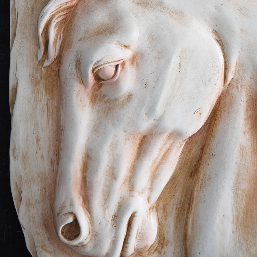 Crafted with meticulous attention to detail, this stunning masterpiece captures the power and grace of majestic equines within the grandeur of a classical Colosseum setting. The resin material lends a lifelike quality to an intricately carved stone horse. To hang, use its two keyhole hangers.