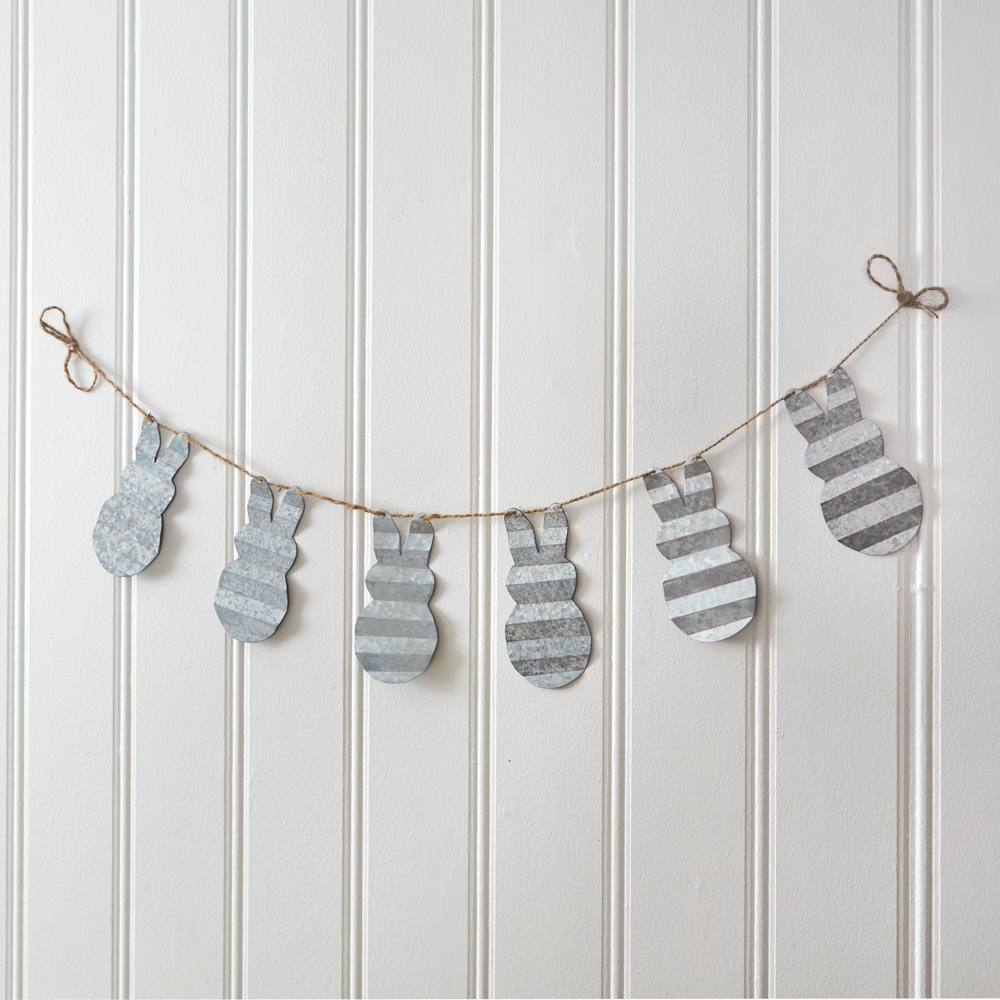 This bunny garland will have you hippity-hopping this Easter. It will fit in perfectly with your existing farmhouse decor. Made of corrugated metal and jute rope, this garland features ten bunnies. Each bunny is 2¾''W x 5''H.