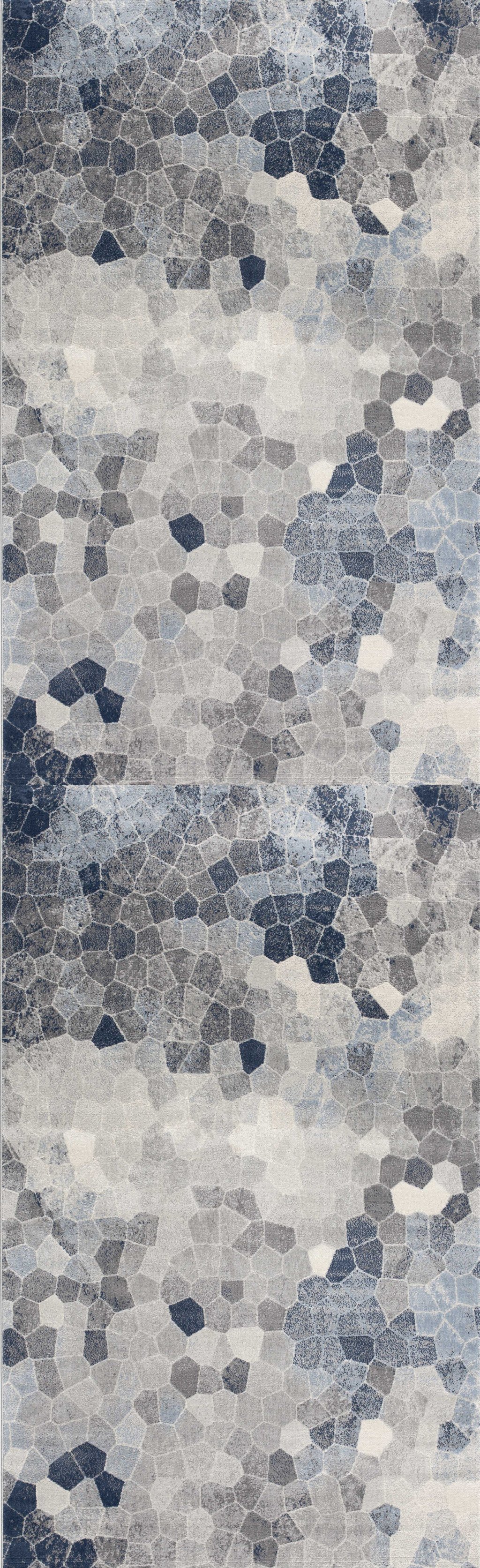Emanating the essence of luxury and elegance, this Navy Blue Cobblestone Pattern Runner Rug presents a beautifully sophisticated color palette to ornate any contemporary or casual setting. The fascinating fusion of navy blue, gray, and ivory offers a tasteful representation of a cobblestone pathway to set a relaxing and inviting tone. Skilfully crafted in Turkey with 100% polypropylene which is not only durable and easy to clean but also inherently stain-resistant to keep its sheen for years to come. The smooth and low pile construction adds to the surface interest for a rich and luxurious underfoot. Place this uniquely designed runner rug against any hardwood or tile floor and it will stay put while tying together the aesthetics of its surrounding. 156” x 27” x 0.4”